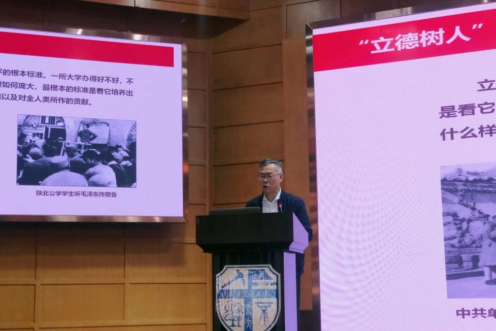 董书记从“‘立德树人’理论渊源及发展”和“努力构建学院新时代‘大思政’育人工作”两方面发表了讲话。首先,董书记引经据典回顾了“立德树人”的含义,阐明立德树人是衡量一所高校办学水平的根本标准。他着重提到延安的“山沟沟”里创办的陕北公学等一批学校在新中国的高等教育史上留下了浓墨重彩的一笔,就是因为它们为党和人民培养了一大批优秀人才。随后,董书记提到党的十九大前召开的全国高校思想政治工作会议,要把立德树人作为高校的根本任务落到实处,进一步做好高校青年学生的思想政治教育工作。他说,“中国共产党人的初心和使命,就是为中国人民谋幸福,为中华民族谋复兴。作为高校教师,为社会主义事业培养合格的建设者和接班人、为中华民族的伟大复兴输送更多高水平、高素质的优秀人才是我们工作的初心,更是我们应当为之奋斗终生的光荣使命和艰巨任务”。他强调高校思想政治工作必须围绕立德树人这一根本任务,树立和坚持大思政工作理念,积极建构大思政工作格局,形成大思政的环境与合力,真正实现全员育人、全程育人、全方位育人。