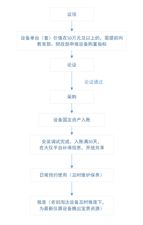 根据《球王会官网仪器设备、家具管理办法》(西交校资实〔2019〕19号)及《球王会官网大型仪器设备开放共享管理办法》(西交校资实〔2022〕5号)精神,大型仪器设备管理是从议项、申报购置指标、论证、采购、设备固定资产入账、共享使用到报废的全过程进行综合管理,具体管理流程如下: