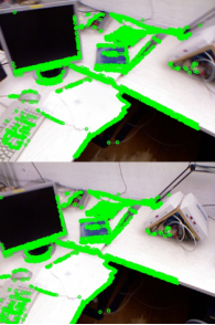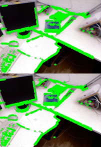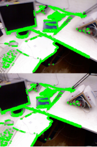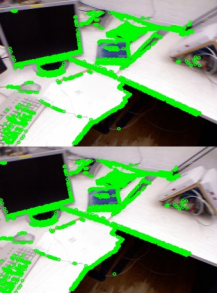 利用8组彩色图像实现了基于RGB-D相机的稀疏直接法和半稠密直接法,前者提取带有特征的像素,后者提取带有明显亮度变化梯度的像素,将第一帧与之后的帧对比,运动越大,像素追踪偏移越大,会出现图像信息丢失的情况。
