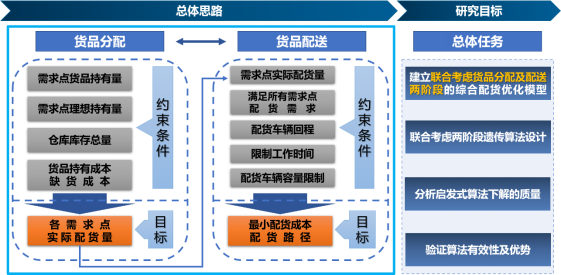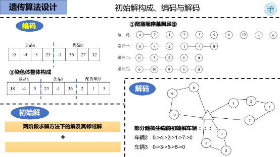 我将毕业设计的主题内容以图片形式进行呈现,主要部分分为研究背景及基础理论理解、联合考虑货品分配及配送的综合配货优化数学模型建立、遗传算法设计、算例计算与效果分析和最终总结部分。