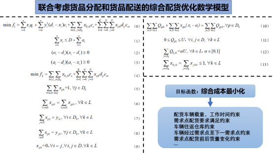 结合货品分配及货品配送两部分综合成本最小化目标,将配货过程约束及配货后的成本分配约束相结合,形成最终的完整数学模型。