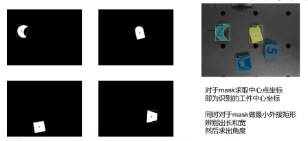 同时结合传统的计算机视觉知识,根据掩膜确定工件的中心位置,同时对掩膜做出最小外接矩形,从而求出旋转角度。
