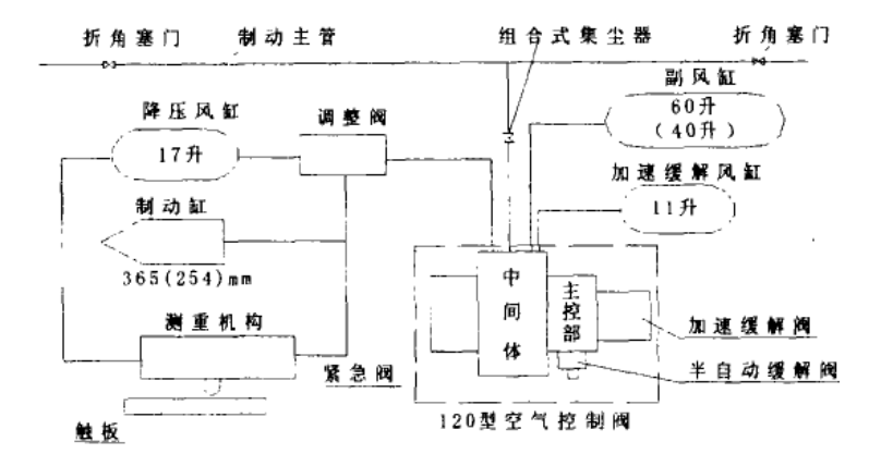 目前我国重载货车大量采用的制动机都是120型制动机,大秦线开行的2万t重载组合列车也采用的120型制动机。有相关文献表示能娉美AAR系列ABDW型制动机的国产150型制动机正在研制试验,但目前可以采用的性能最好的国产重载列车制动机只能是120型制动机。120型空气制动机构成简图如图6所示。