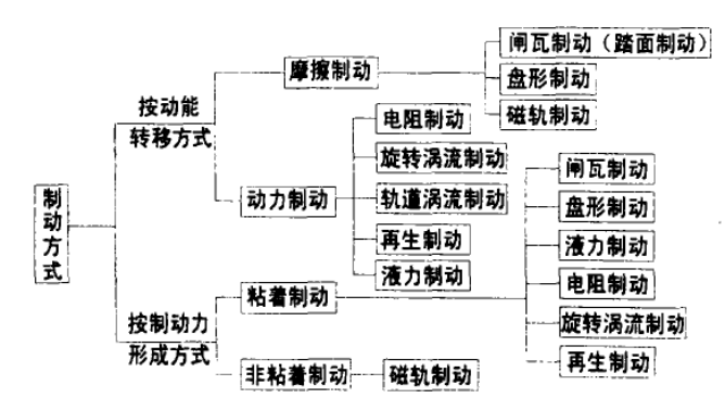 制动方式是指制动时列车动能的转移方式或制动力的获取方式。图4为制动方式的分类图。目前,国内外运行速度不超过120km/h的铁路货车的制动方式大都采用闸瓦摩擦制动。原因是闸瓦制动具有结构简单,制动控制方便,通过制动可起到对车轮踏面的清扫作用的优点。我国的25t轴重重载货物列车运行速度不超过120km/h,也应采用闸瓦制动的制动方式。