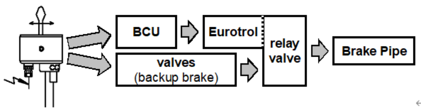 自动制动控制器的电气部件通过BCU(制动控制单元)产生所需的信号来控制Eurotrol,如果BCU故障,则通过备用制动模块来控制均衡风缸的压力。BCU(制动控制单元)或备用制动模块接收到来自制动控制器硬件接触信号后,控制均衡风缸的压力在一定的时间内变化。
