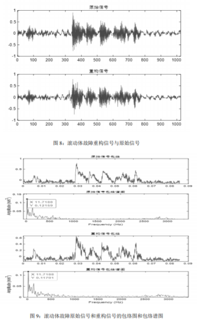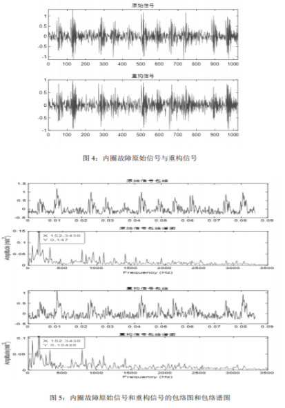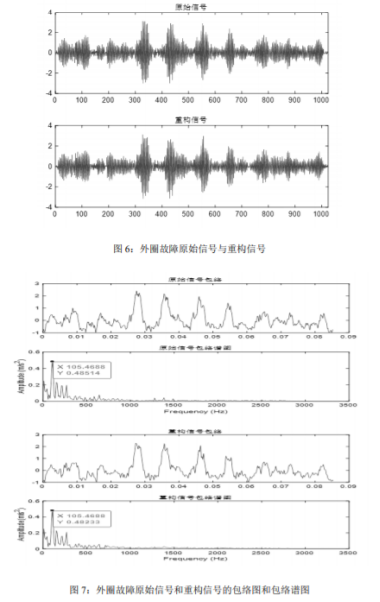 接下来我使用训练出的正常状态、内圈故障、外圈故障和滚动体故障四类过完备字典。分别对对应状态的故障信号进行了稀疏重构,测试信号、重构信号以及各自的包络谱图如下。