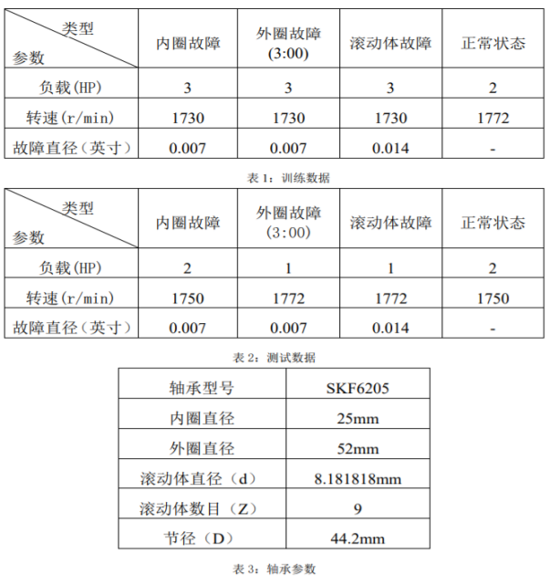 对所提出的方法进行验证,采用美国凯斯西储大学实测信号中正常状态、内圈故障、外圈故障和滚动体故障4种状态的数据。下图为实验台。训练数据选取如表1。测试数据选取如表2。轴承参数见表3。