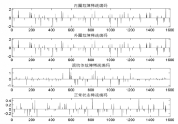 然后从正常状态、内圈故障、外圈故障和滚动体故障四种类型的测试数据中每类选取1024个数据点进行测试。基于每类测试样本,采用正交匹配追踪(OMP)算法求解每类测试数据对应与该类字典的稀疏编码。每类过完备字典的部分原子和每类测试数据的编码结果如下图所示。