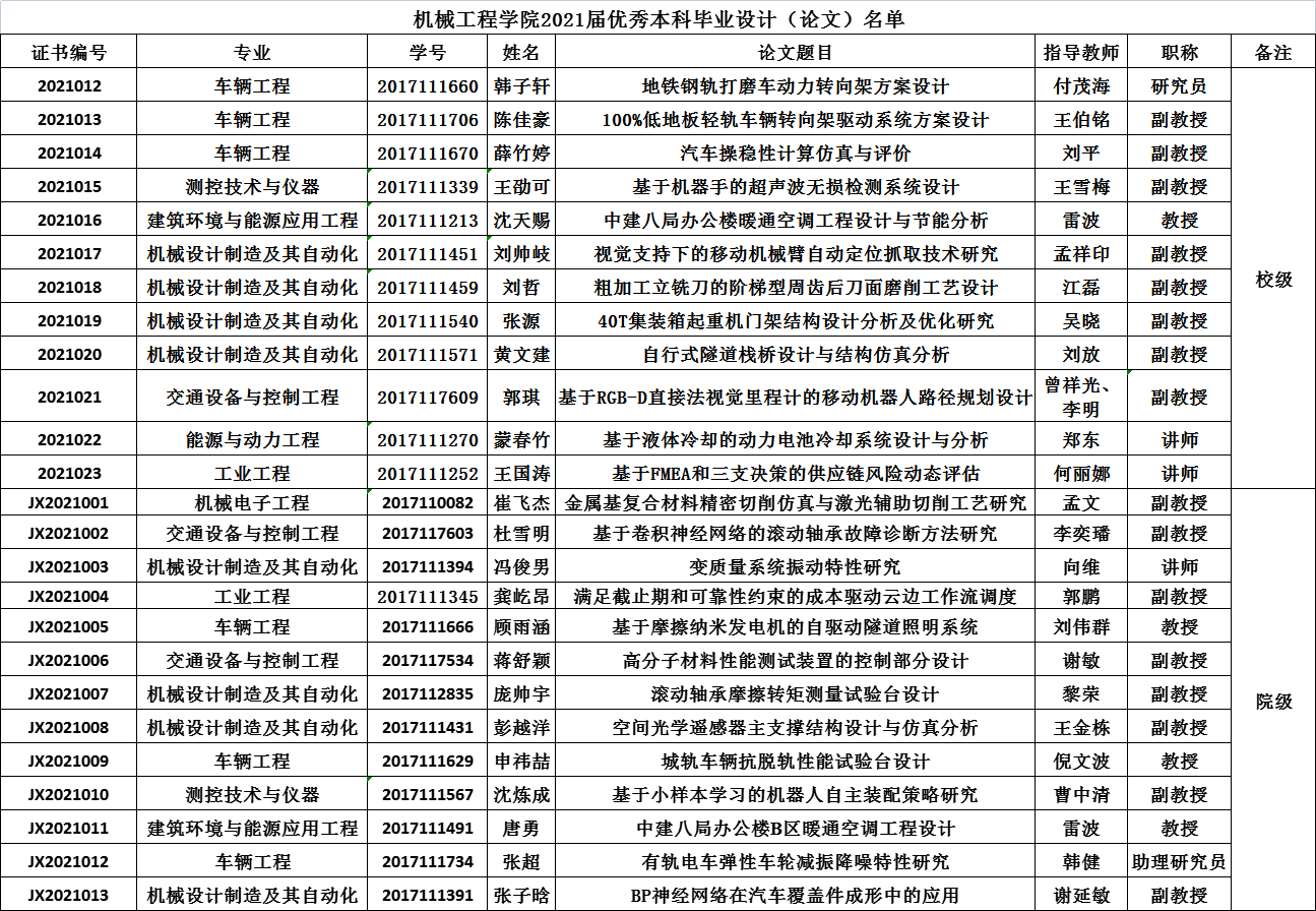 根据《球王会官网本科毕业设计(论文)管理办法》、《机械工程学院本科毕业设计(论文)管理办法》的相关要求,为加强对本科生毕业设计(论文)的全过程管理,展示学院优秀本科毕业设计(论文)成果,树立榜样、表彰优秀。经系所推荐、学院组织评审、学校终审,现推荐12篇校级优秀本科毕业设计(论文)、13篇院级优秀本科毕业设计(论文),评选结果公布如下: