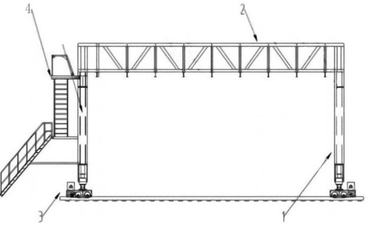 1-门型架装置、2-桁架结构、3-行走装置、4-爬梯装置、5-型边模支撑、6-顶模装置、7-边模装置。