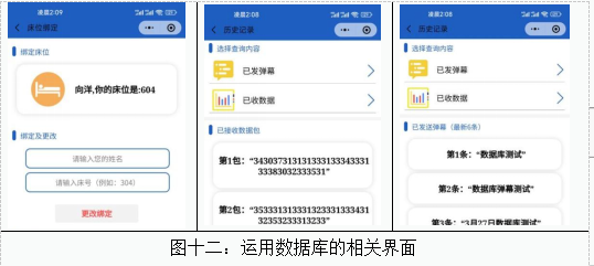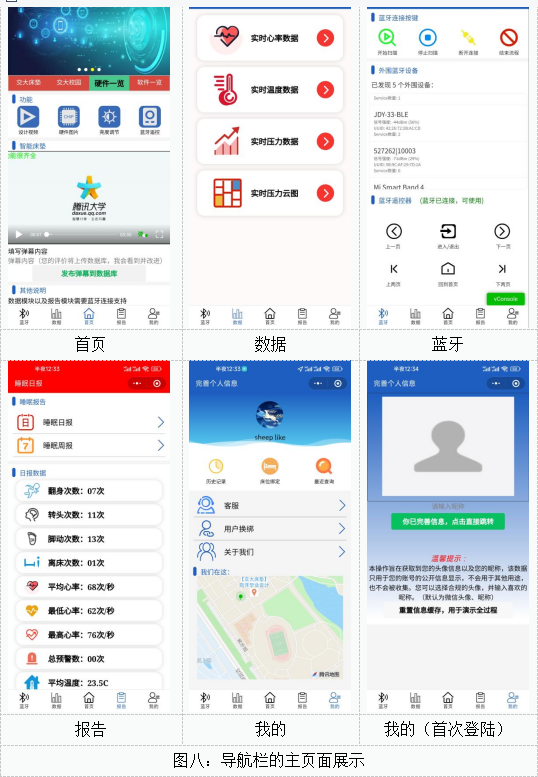 该微信小程序可以实现多种功能,包括上传数据到数据库,从数据库中拉取数据;与单片机通过BLE蓝牙设置建立通讯;获取单片机传过来的传感器的实时数据并显示在相应界面;个人中心界面以及配套的各种小功能,历史查询,床位绑定,客服,地图查看等;亮度调节,图片查看,视频查看,发送弹幕4等;查看当日睡眠报告,查看周报等;蓝牙控制单片机等。除了以上的导航栏主页面,在每一个页面下还有很多子页面,在这里展示部分子页面,组图如下图图九: