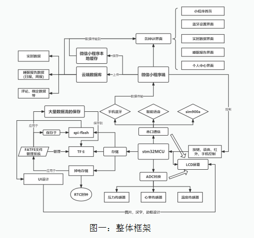 本毕业设计是基于STM32单片机来设计开发的。以STM32作为运算核心,向外分出三个主要的功能模块,分别为串口通信、存储介质的运用,以及ADC模数转换模块。手机端我自己设计开发了一个微信小程序,通过BLE蓝牙通讯与单片机建立连接,实现了单片机的关键采集数据向小程序端传输,以及小程序端作为遥控器控制单片机的双向数据传输。具体的框图如下图图一所示: