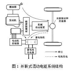 (2)分析混合动力汽车电驱系统的结构、运行模式、耦合装置及特点,参考相关文献和书籍,将并联式的连接方式引入现有的双动力源混合动力汽车中,提出本次并联式混合动力传动系统的总体设计方案。