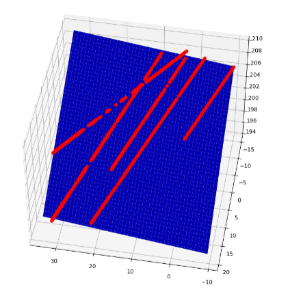 相机标定采用张正友标定法,可求出相机内部参数,即像素坐标到相机坐标系的转换矩阵;光平面标定通过多组拍摄激光照射在棋盘格上的图片,求出线激光光源产生的光线平面在相机坐标系下参数,结果如图3所示,其中红色为光条纹点集,蓝色为拟合的光平面;旋转轴标定同样通过拍摄多组棋盘格绕转台旋转的图片,通过拟合圆心以及最小二乘法求出转台的旋转轴在相机坐标系下的直线方程,结果如图4所示,图中蓝色点为棋盘格内角点,红色点为拟合的圆心。