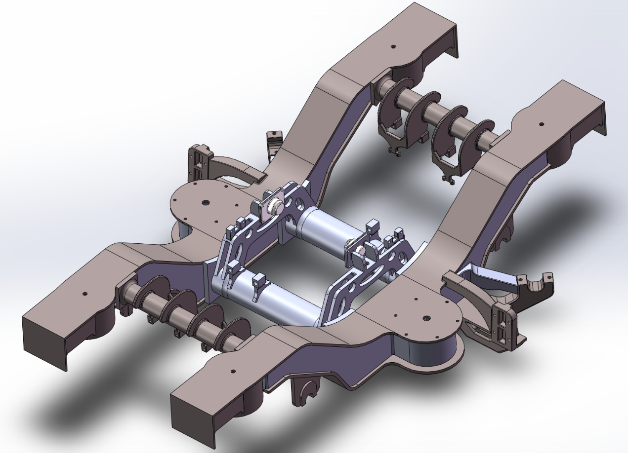 由各个模块组装成转向架整体三维模型,如下图13所示,形成较完整(无端部制动梁与轮盘制动系统)的总体技术方案。