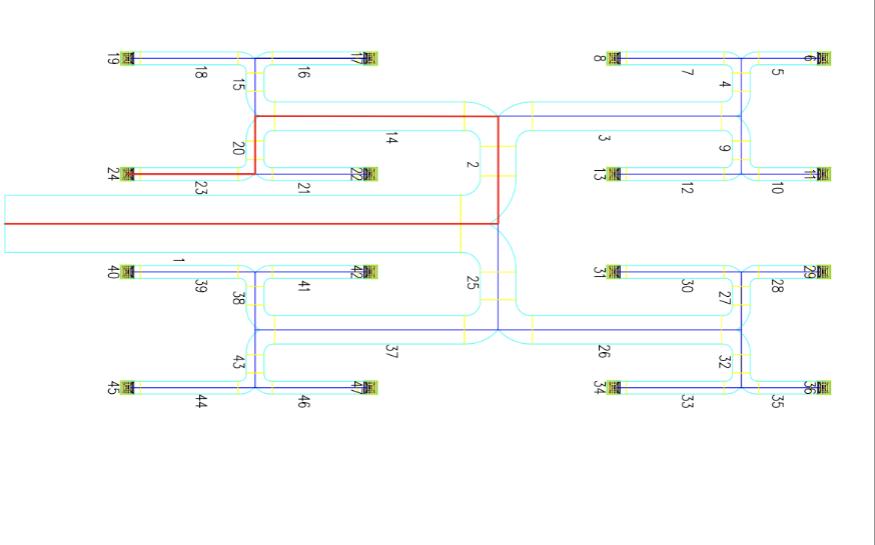 以大法庭为例:如图中红线标记所示最不利环路的总阻力为23 Pa。整个管路采用对称布置不需要设置平衡阀来保证水力平衡,每个末端所在的环路不平衡率接近于0,系统基本可以稳定运行按设计分配预定风量。