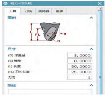 5. 利用UG软件确定五轴数控加工的道具参数:因叶片进出气边为圆形曲面加工,并考虑到工装干涉问题,采用8mm球头铣刀,通过刀具试加工对比,采用两支蓝帜LC630T 45A球头铣刀完成粗、精加工。