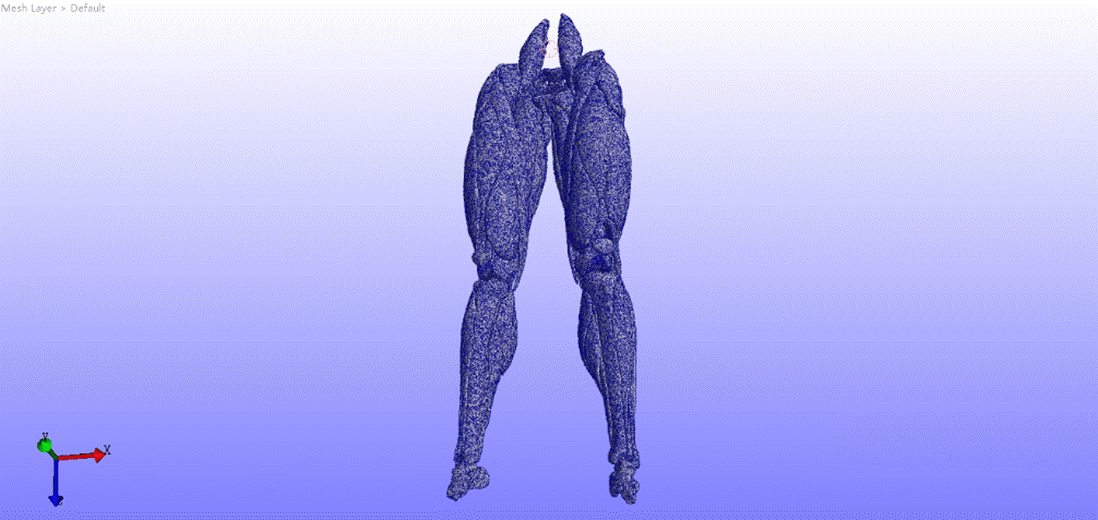 (6)对获取的人体下肢模型进行数据处理与转换。首先通过Geomagic软件是对从网站获取的130多个骨骼、软骨、韧带以及肌肉STL模型进行去噪点、网格修复、实体编辑等处理获取IGS格式的实体模型。之后将处理好的IGS实体模型导入Hypermesh软件进行有限元网格划分以及优化,并在检查网格质量后导出.inp文件,为后续导入FEBio软件进行有限元分析做准备。