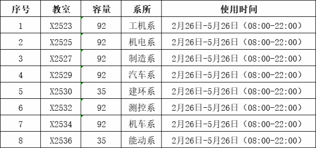 2.所有专用教室将从2月26日全面开放,若使用中有问题,请与二号教学楼物管X2219(电话:66367711)或教务处实践科(电话:66366254)联系。