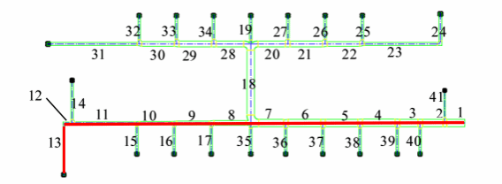 计算可知最不利环路的总阻力77Pa,其中十层新风机组HDK05的机外余压为210Pa,满足要求。由于支管数量较多,任意调节一管道会引起整个送风管路的不平衡率增大,因此在对该区域风管进行水力计算后,需分别在编号为 14、15、16、17、18、19、25、26、27、28、35、36、37、38、39、40、41管道加平衡阀进行调节,以此使相邻的管路在风量变化时,整个管路能够正常使用,增加了系统的安全性。