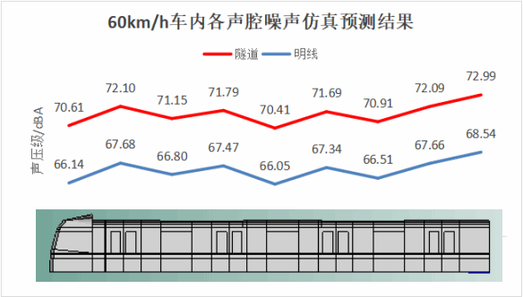 4. 仿真预测与验证:为确保本论文相关研究结果具有可靠性,在进行仿真预测之前,需要对建模方法准确性以及隧道混响会提高地铁车辆车内噪声声压级进行验证。本论文的声学模型建模方法与论文《隧道内地铁列车车内噪声特性及其关键影响因素研究》中的声学建模方法相同,该文献与线路试验结果进行对比验证了仿真预测模型的准确性,将本论文的仿真预测结果与该文献结论对比,基本吻合,故证建模方法具有一定准确性。本论文相关仿真预测结果如图9、图10所示。