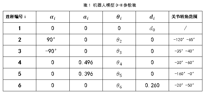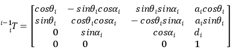 按照D-H法,利用一个四阶其次变换矩阵,可以描述相邻两个杆件的空间关系,求解机构的末端坐标系相对于固定参考系的等价齐次变换矩阵,是进行正运动学求解的经典方法。连杆之间的变换可最终归结为如下一个矩阵通式: