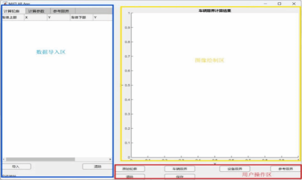 4.如图2所示,已完成APPDesigner界面的搭建,APP功能包括:数据导入、数据清除、图像绘制、图像清除、计算数据导出等,图中蓝色部分为数据导入区,负责导入车辆计算轮廓坐标、车辆限界计算参数、参考限界坐标;黄色部分为图像绘制区,负责绘制车辆计算轮廓、车辆限界、设备限界、参考限界;红色部分为用户操作区,负责选择所需进行计算并绘制。