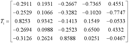 基于牵引网线路参数推导相模变换矩阵,并对接触网线路进行电磁解耦,计算得到行波各模量的衰减系数和相位速度,根据衰减系数和相位速度的频率特性提取适用于测距的最优模量。为了分析牵引网发生故障时行波各模量的传播特性,通过MATLAB进行编程求取实数化之后的电流相模变换矩阵Ti。以5kHz为例,电流相模变换矩阵如下所示: