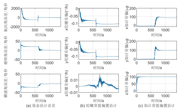 的估计精度均得到显著提高,接近理论值。惯性器件误差估计精度的提高,有效改善了方位角和两个水平姿态角的估计精度,如图(a)所示。以上结论与机动拐弯能够提高姿态误差的可观测度,进而提高姿态误差估计精度的可观测性分析结果相符。