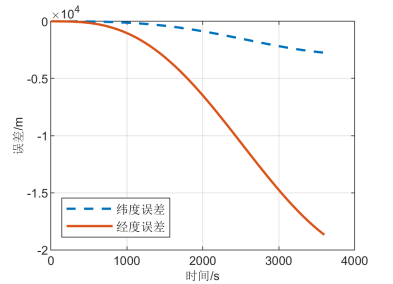结果分析:图2中数据是将经度误差与地球半径相乘,转换成单位为m的东向位置误差;同理将纬度误差转换成单位为m的北向位置误差。静态导航仿真1小时后,末点位置误差约为