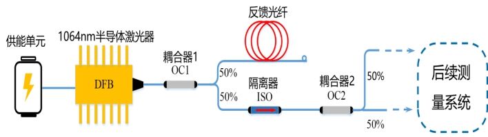 在该系统中,1064nm半导体激光器启动后发出的激光会首先经过耦合器被分为两路,其中一路激光回会作为压缩激光,经过反馈光纤,在反馈光纤中不断进行瑞利散射并对对激光器发出的激光线宽和噪声不断进行压缩和抑制,从而不断优化激光器性能,而另一路激光则经过反馈光纤中的瑞利散射对其激光线宽和噪声进行抑制和压缩后,通过隔离器,被耦合器均分为两路以便接入后续的测量系统。其中隔离器的主要作用是使阻止激光向回传播,从而使下路光纤中的激光的传播方向是不断向前发射的,确保用于后续测量的激光方向的单一性,为后续测量做好准备。