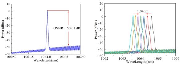 由图可以看到在1064nm及其附近的激光波长段,激光的光信噪比相对于其他波长段要高许多,差值达到54dB,即在1064nm波段的激光比其他波段的光在功率上要强数十倍,说明分布弱反馈环节起到了较好的作用。