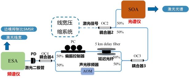 经过线宽压缩系统的激光,被耦合器一分为二后一路连接光谱仪,通过光谱仪测量其激光光谱。而另一路激光被用来测量激光线宽和边模抑制比SMSR。采用的方法是短相干延迟自外差法,来自线宽压缩系统的激光信号激光被分为两束,一束通过一段很长的延迟光纤,与另一束光解相干;另一束光不经过处理,但由于整个系统工作在零频附近,较容易引入由于周边环境引起的变动,如空气的微振动和温度的细微变化等因素带来的影响,使得整个仪器对环境的要求比较高,所以通过添加一个声光调制器来将之后的拍频搬移到非基频,去除直流的影响,然后利用偏振控制器调节到和另一束光相同偏振,使得拍频的功率达到最大。