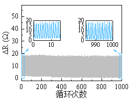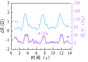 除压敏曲线外,压力传感器的最低检测限、响应特性和疲劳特性也是重要的指标,选取0.83 J/mm2(相对能量)刻蚀得到LIG压力传感器做进一步的测试。最低检测限反映了压力传感器能够产生响应的压力下限,表征了灵敏度特性。LIG压力传感器的最低检测限约45 Pa(图3a),对应的电阻变化范围大约为2 Ω。响应时间反映了压力传感器响应的速度,包含对压力的反应时间和压力撤去后的恢复时间。LIG压力传感器的上升响应时间约为200 ms,下降响应时间约为160 ms(图3b)。阶梯测试反映了传感器能够监测连续的压力变化(图3c)。传感器的疲劳特性表征了传感器的寿命,即传感器的耐用性。在8 kPa的1000次循环测试下,LIG压力传感器传感器的输出保持稳定(图3d),展现了良好的疲劳特性。