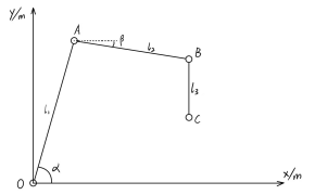 令α大于0度,β小于0度,三段手臂的臂长尽量小。机械手需要到达6个极限工位,分别为(1.553,1.167)、(1.553,-0.125)、(3.774,1.167)、(3.774,-0.125)、(2,-1.3)、(3,-1.3)。
