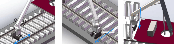 (c)板车方向机械臂的极限工位 (d)轨道方向的机械臂极限工位