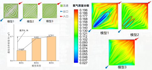 4.初始模型的仿真分析与优化改进。图4为仿生叶脉流场优化改进的过程。首先对初始模型1进行CFD计算, 其最大功率密度为0.6429W/cm2,低于平行蛇形流场与蛇形流场,比平行蛇形流场低8.41%,但其气体进出口对角线及其附近氧气质量分数分布过低。为此,作者重新进行流道设计。本次模型重新进行了流道排布,除了使流道与脊的宽度比接近1:1,从而让流道排布更均匀之外,还将二次分支流道的拐角变大,改善气体分布均匀性并降低压降,设计的模型称为模型2。经过仿真分析,模型2的最大功率密度为0.6930W/cm2,相比模型1提升7.8%,另外通过其阴极侧氧气分布云图可知,在流道进出口对角线附近仍存在氧气质量分数较低的区域。为解决上述问题,对模型2进行优化改进,同样对流道与脊的宽度以及一级分支脊夹角进行调整,得到的模型称为模型3,并对其进行仿真分析。对三个模型横向对比分析可发现,模型1到模型3的最大功率密度逐步提升,氧气分布逐渐均匀,且模型3相比模型1最大功率密度提升9.1%,相比模型2提升幅度有限。由此可知,模型3的结构可视为目前结构优化的最优解。