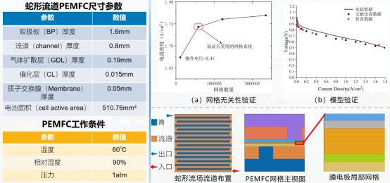 1.文献查阅与模型验证。查阅国内外针对燃料电池双极板流道结构研究的文献,依据文献中的结构参数建立PEMFC模型,并进行网格无关性验证与模型验证,如图1所示。仿真结果表明,仿真数据与实验数据吻合良好,验证了模型的可靠性。