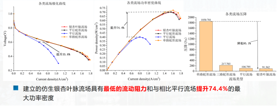 回答:关于仿生设计,首先,银杏叶脉输送营养物质进入叶片的方式与PEMFC内反应气体进入双极板流场区域的方式是相似的,均由一个总流道分支为多个流道来实现介质的扩散;其次是设计的流道模拟了银杏叶脉的二叉分枝结构,使得反应气体分布更均匀。相比传统的平行流场,在入口段的气体分配更均匀,且最大功率密度提升了74.4%。相比传统的蛇形流场,虽然最大功率密度相近,但流道进出口压降得到了极大的改善,降低了95.1%。