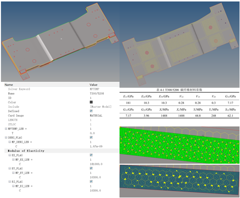 (3)初步开展了枕梁结构的强度校核工作。选用了Hypermesh作为有限元分析软件,导入SOLIDWORKS三维模型后,进行了中面抽取、几何修复以及定义材料等操作。其中面板采用碳纤维环氧树脂复合材料,蜂窝采用铝合金,单元均定义为壳单元。