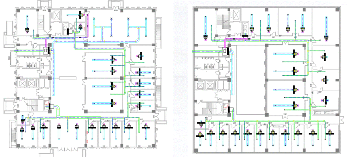 (5)空调风水系统设计:对各分区风系统进行气流组织计算,分析气流组织布置的合理性,再对风系统进行详细的水力计算。对水系统进行分区,考虑水系统,冷却水和冷冻水系统水管布置合理性,以及水系统的水力计算和设备选型计算。
