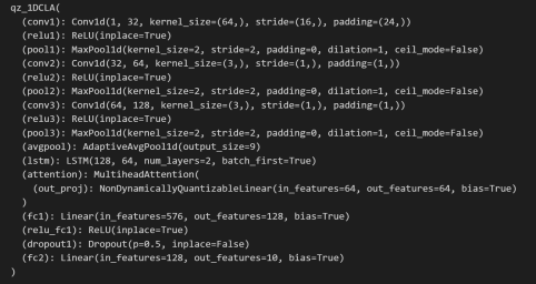 (3)模型训练与优化:构建了完整的训练流程,采用交叉熵损失函数与Adam优化器进行模型优化,并针对一维时间序列信号特点在卷积层参数、池化层结构、LSTM单元数量等方面进行多轮调参实验。同时,构建了模型参数统计函数用于控制网络复杂度。