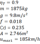 (1)对于发动机而言,首先是发动机单独驱动时以最高车速为目标确定发动机所需最大功率,此时的最高车速为185km/h。其次是发动机单独驱动时以最大爬坡度45%为目标确定发动机所需最大功率。