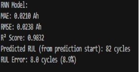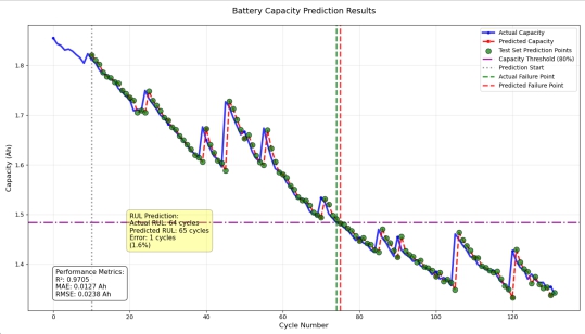 在设定的预测起点开始预测,拟合程度较高,MAE,RMSE较小,R²接近1,说明拟合程度高,同时计算出来的RUL误差只有1.6%,说明模型的可靠度较高。