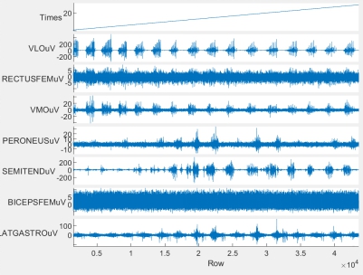 (1)下肢表面肌电信号sEMG:肌电图主要讨论的是骨骼肌的运动过程,在肌肉受到刺激的同时,会产生一连串的动作电位。sEMG就是在相应肌肉表面通过电极,从而记录下一连串的MUAP电信号,透过肌电图便可以得知周围神经、神经元、神经肌肉接头及肌肉本身的功能状态。