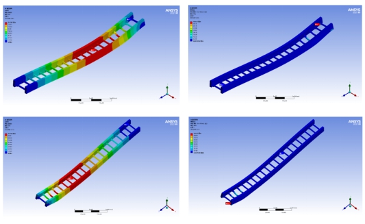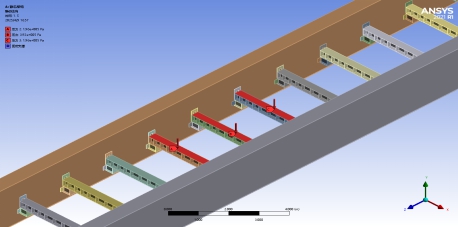 分析求解结果,确定栈桥在当前荷载状态下的变形范围和应力范围,并找到变形最大值即其位置和应力奇异值及其位置,对比相关文献资料评估有限元分析结果。更改载荷施加的位置,重新对栈桥的效应力与变形求解,对比载荷施加在不同位置时主梁的应力及变形情况。
