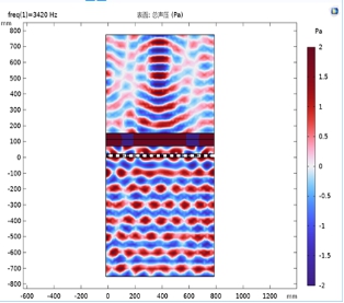 仿真场景为0.1MPa平面波从下向上入射,不考虑传热问题。加入阻抗匹配层后,声波可以无损的穿过阻抗传到到组织中。而没有加阻抗匹配层时,声波穿越硬物质后声压急剧下降,其幅值仅为水域中的1/3,能量大量耗散。