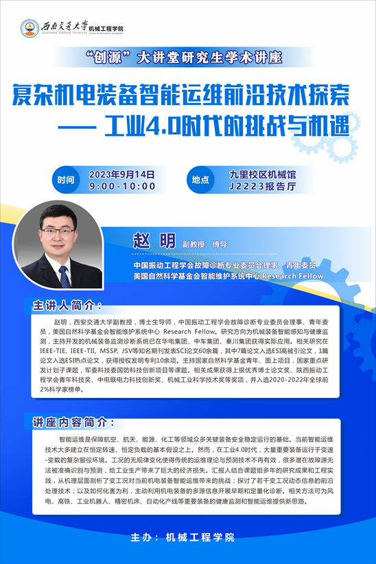 主讲人简介:赵明,西安交通大学副教授,博士生导师,中国振动工程学会故障诊断专业委员会理事、青年委员,美国自然科学基金会智能维护系统中心 Research Fellow。研究方向为机械装备智能感知与健康监测,主持开发的机械装备监测诊断系统已在华电集团、中车集团、秦川集团获得实际应用。相关研究在IEEE-TIE, IEEE-TII, MSSP, JSV等知名期刊发表SCI论文60余篇,其中7篇论文入选ESI高被引论文,1篇论文入选ESI热点论文,获得授权发明专利10余项。主持国家自然科学基金青年、面上项目,国家重点研发计划子课题,军委科技委国防科技创新项目等课题。相关成果获得上银优秀博士论文奖、陕西振动工程学会青年科技奖、中电联电力科技创新奖、机械工业科学技术奖等奖项,并入选2020-2022年全球前2%科学家榜单。